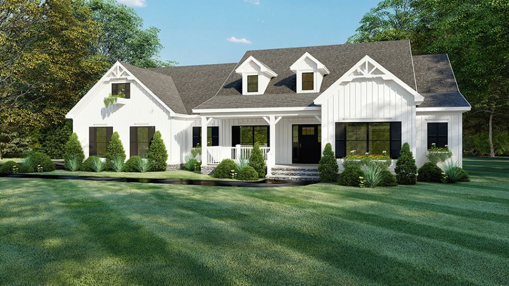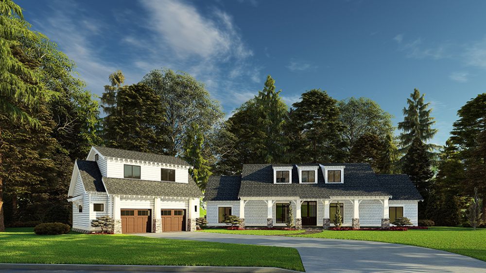 This plan comprises 2,388 heated square feet with 3 bedrooms and 3.5 bathrooms. The two-story living/dining area has a double-sided fireplace. The Master Suite has a large bathroom with double sinks, a toilet closet, a separate tub and shower, and leads to a large walk-in closet. There is a half bath convenient for guests in the hall. The kitchen features a large island with seating and a walk-in pantry.